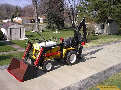Paul F. of Amherst, MA (hey that's me!) built this loader for his cub cadet 149 garden tractor in 1998 and soon after began selling plans to the public as p.f.engineering