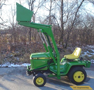 the loader for this John Deere 318 garden tractor was built by a vocational school class at Montachusett technical vocational school in Fitchburg, MA (www.montytech.net). the tractor was owned by their teacher and the class project was a great way to learn about hydraulics. great work!
